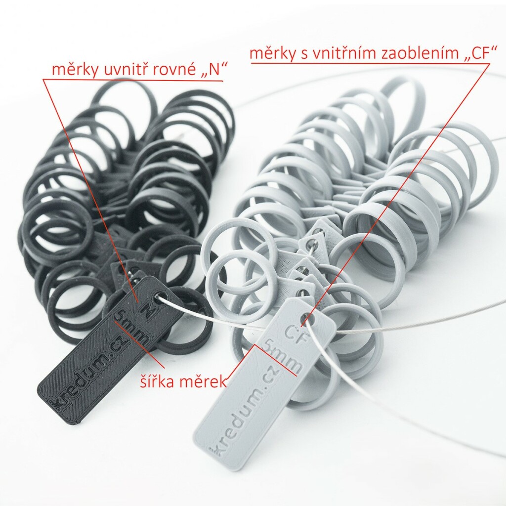 Často se nás ptáte, zda zvolit prsteny s rovnou vnitřní stranou či prsteny uvnitř zaoblené, nazývané též jako prsteny comfort fit. Na toto není lehké odpovědět. Obecně se vnitřní zaoblení doporučuje pro širší prsteny, aby se kůže pod nimi moc nepotila, ale záleží také hodně na typu prstů. Každému sedí trochu něco jiného a není nad to, si to osobně vyzkoušet. Pokud k nám nemůžete přijet na osobní schůzku, doporučujeme to vyzkoušet právě na našich měřících sadách. Pokud si vyzkoušíte dva kroužky ve stejné velikosti a jeden bude mít rovnou vnitřní stranu a druhý vnitřní zaoblení, ten s vnitřním zaoblením vám bude pravděpodobně o něco volnější. Objednejte si proto od dané šířky oba typy měrek a uvidíte, které vám padnou lépe.