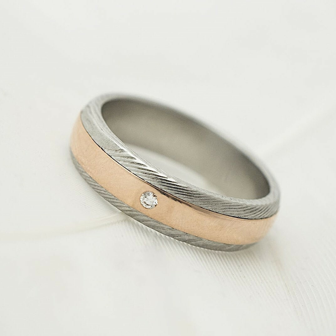 Precious metals can be combined with a stainless steel, titanium or damasteel. Thanks to this combination, the ring gains a mark of attractiveness and uniqueness. A combination of different precious metals creates an amazing MOKUME GANE which is unique for its beautiful structure of blended metals.