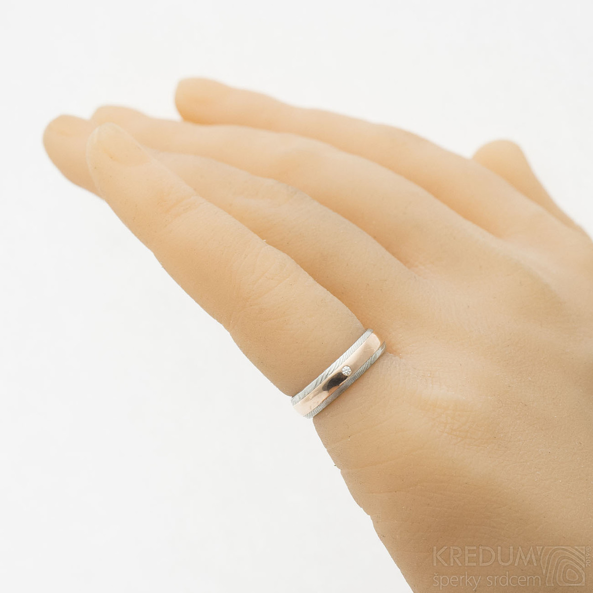 Ručně vykovaný prsten z nerezové oceli damasteel, doplněný zlatým kroužkem a osazený diamantem. Nabízíme ho jako snubní prsten, ale stejně krásně vynikne i jako zásnubní prstýnek nebo dárek z lásky ♡.