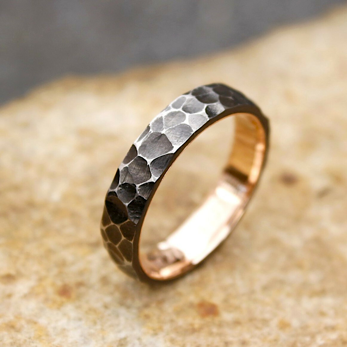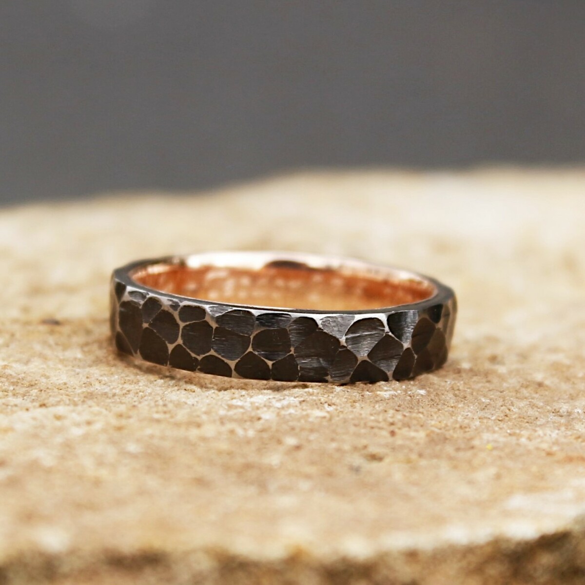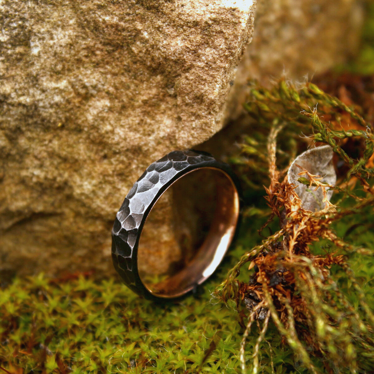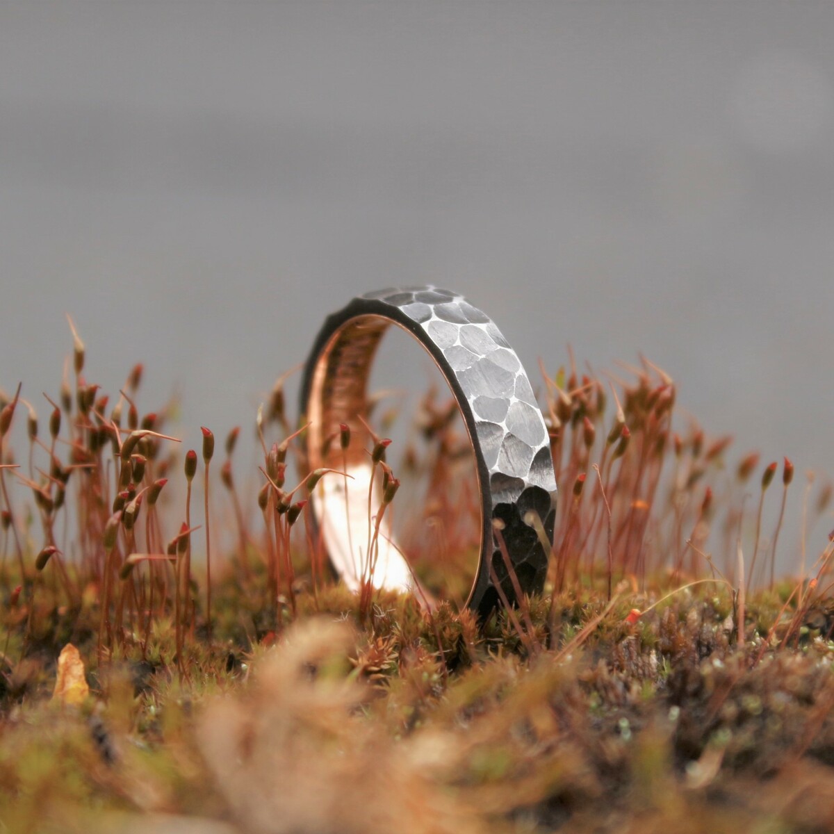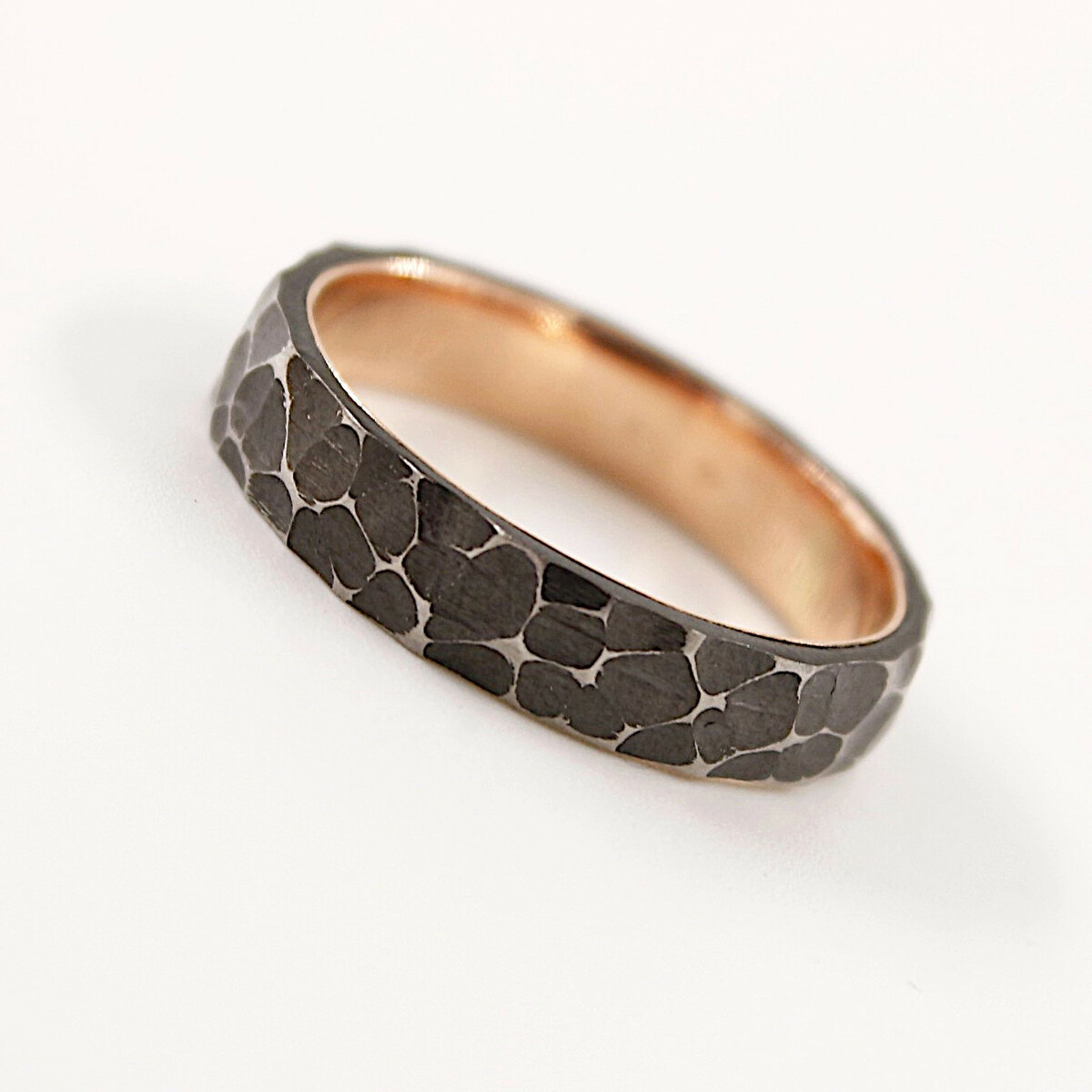 The inner band is made of 0.585 (14 karat) red gold. We can also use yellow or white gold upon request. The gold band is carefully smoothed and polished for comfortable wear.