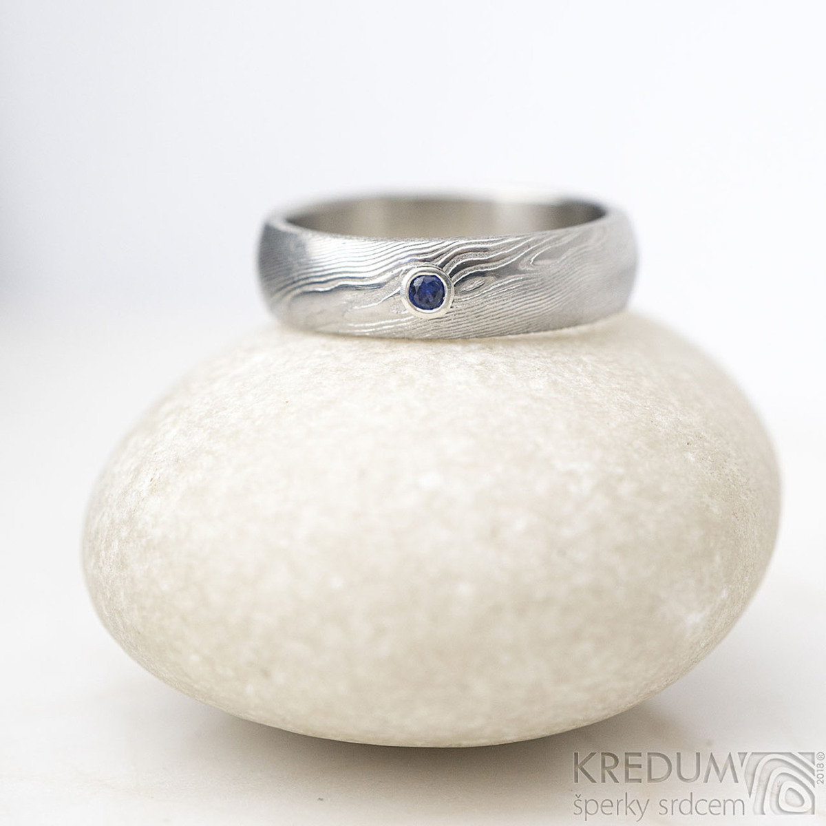 Ručně kované snubní prsteny z nerezové oceli damasteel. Jedná se o materiál, kde dochází k vrstvení dvou nerezových ocelí. Tím vzniká neopakovatelná struktura, která dává prstenům nevšední a jedinečný vzhled připomínající dřevo. Lze je vyrobit také v jiných strukturách.