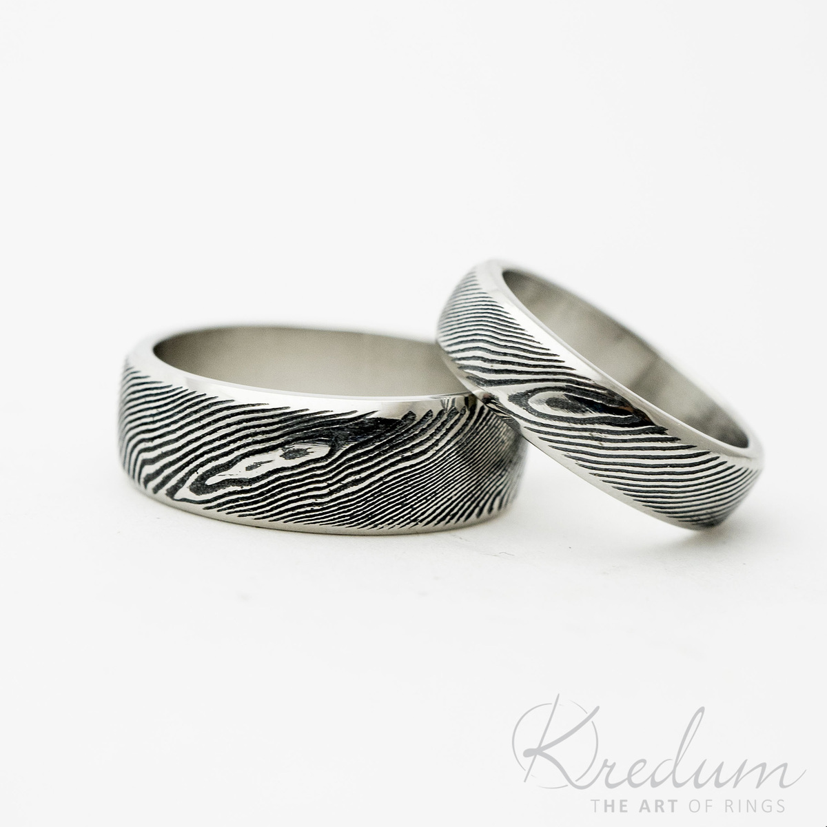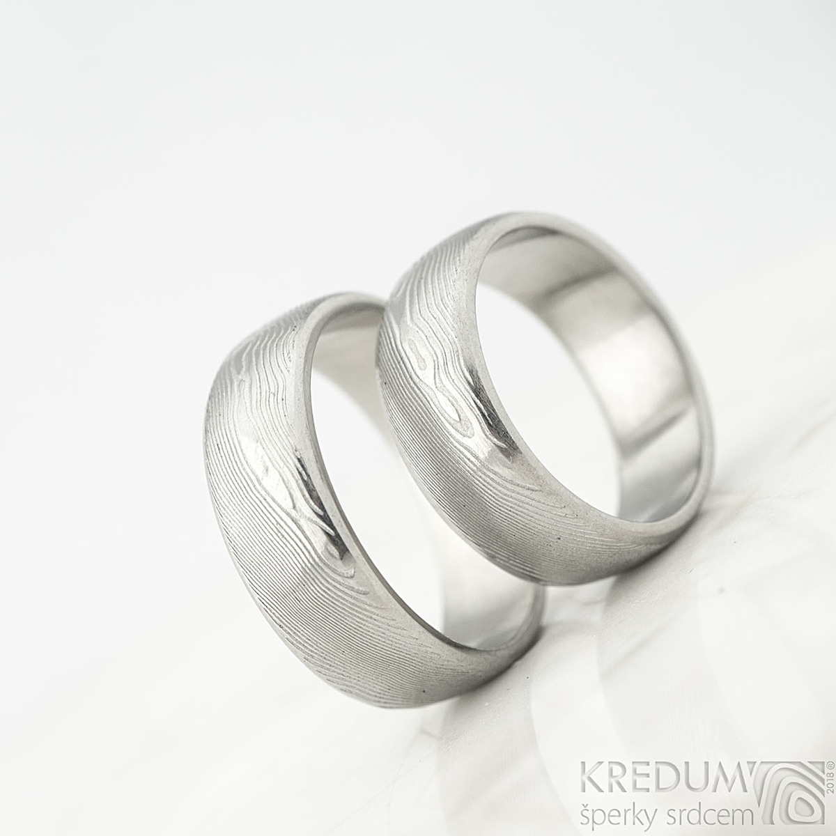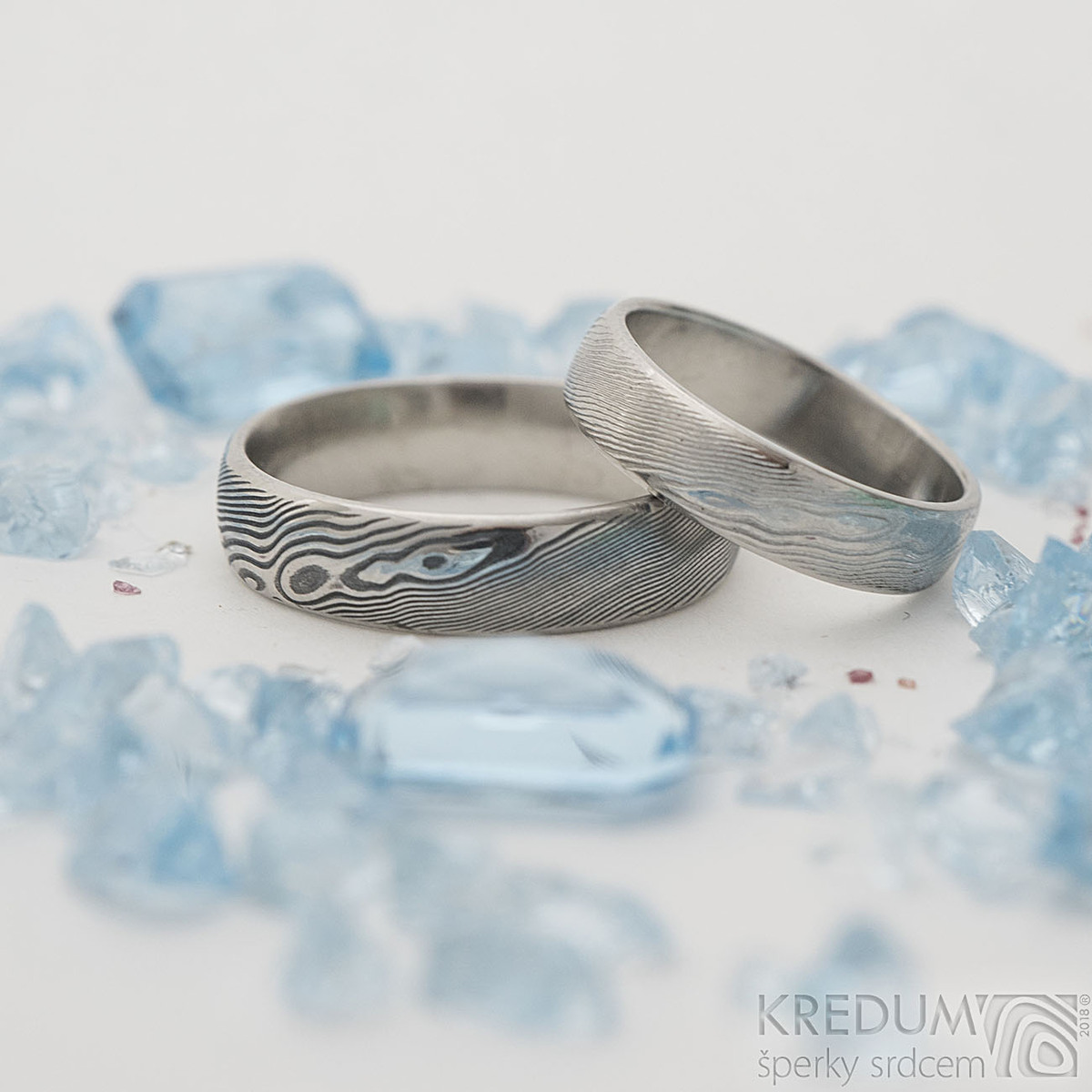 Ručně kované snubní prsteny z nerezové oceli damasteel. Jedná se o materiál, kde dochází k vrstvení dvou nerezových ocelí. Tím vzniká neopakovatelná struktura, která dává prstenům nevšední a jedinečný vzhled připomínající dřevo. Lze je vyrobit také v jiných strukturách.