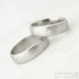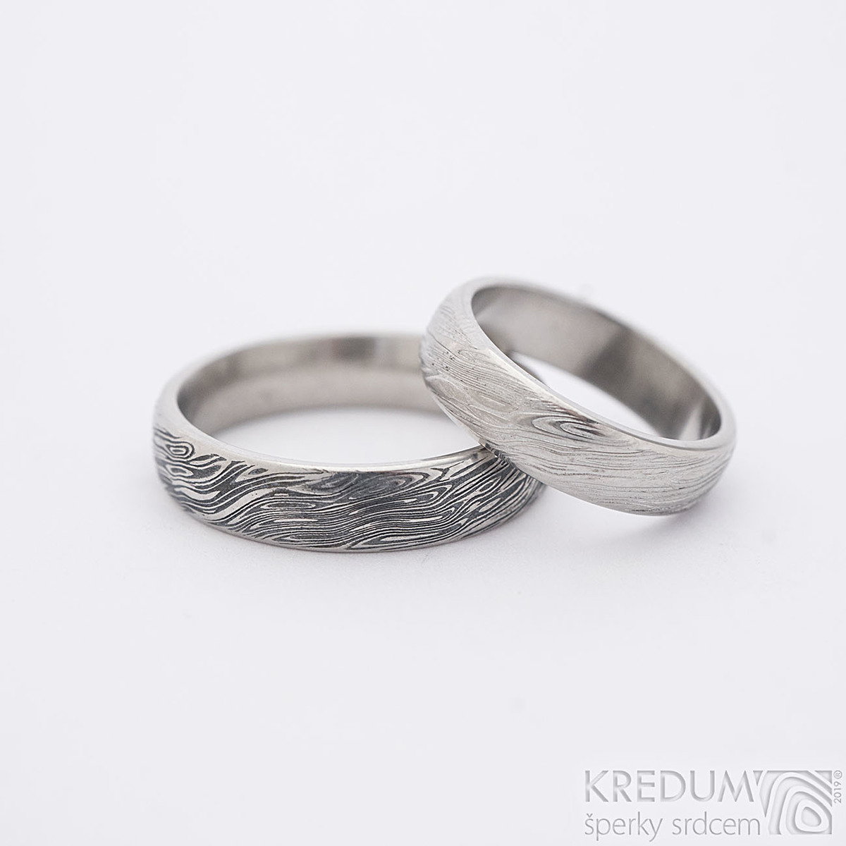 Ručně kované snubní prsteny z nerezové oceli damasteel. Jedná se o materiál, kde dochází k vrstvení dvou nerezových ocelí. Tím vzniká neopakovatelná struktura, která dává prstenům nevšední a jedinečný vzhled připomínající tekoucí vodu. Lze je vyrobit také v jiných strukturách.