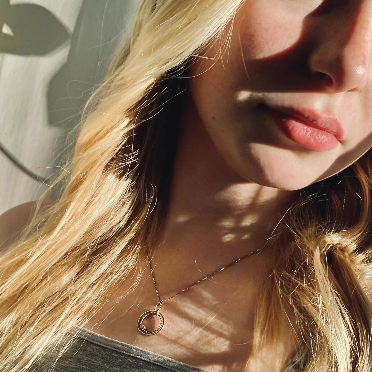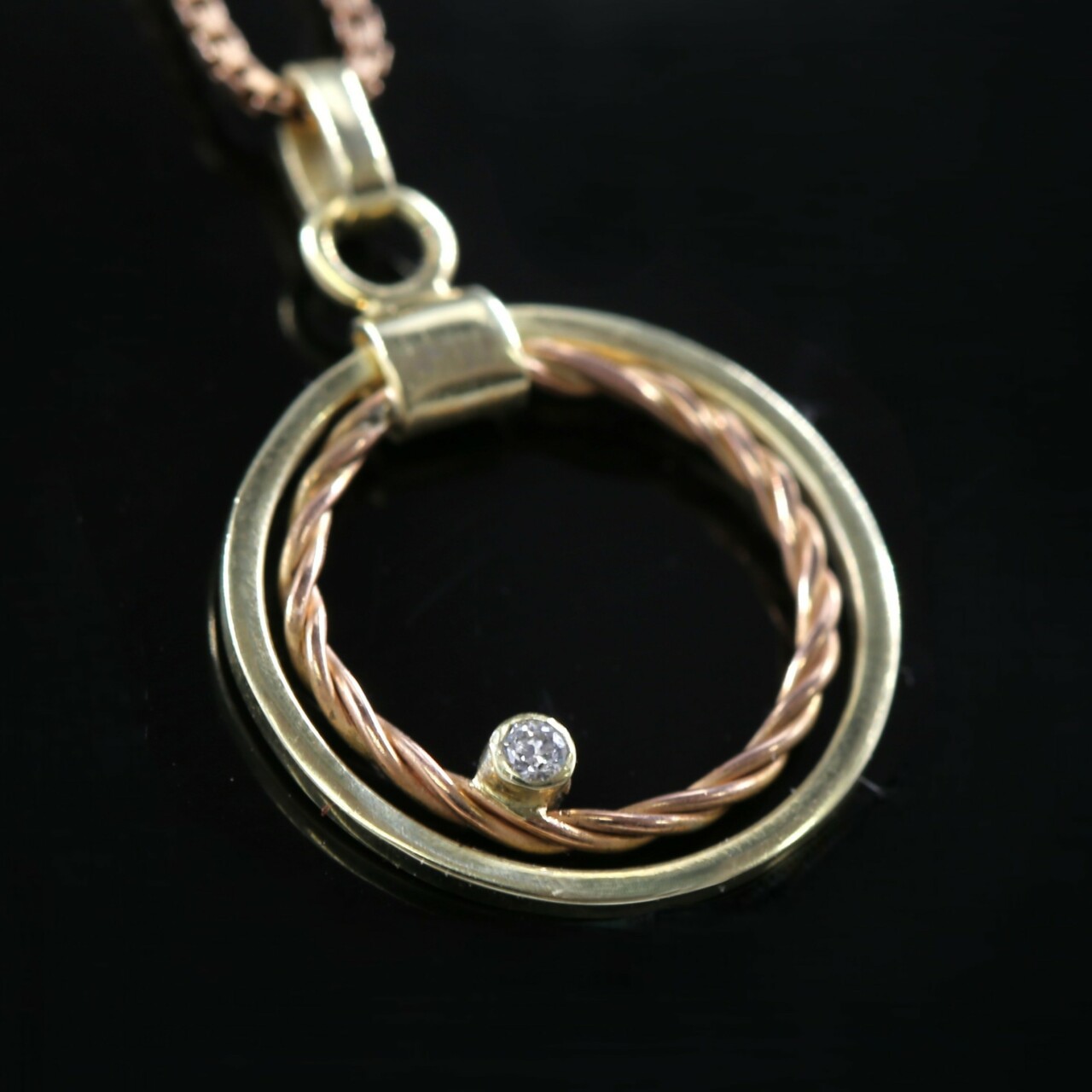 The pendant is made from a combination of white and yellow gold, complemented by a 1.7 mm brilliant-cut diamond that sparkles delicately and gives the jewelry a luxurious feel. The minimalist circular shape symbolizes harmony and infinity – the ideal gift for someone special or a stylish accessory for everyday wear.
