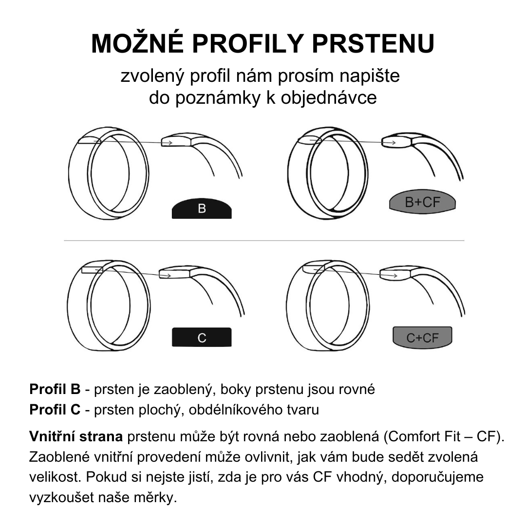 Abychom vám mohli prsten vyrobit, potřebujeme vědět požadovanou velikost, šířku, tloušťku a profil prstenu (viz přiložená fotka). Požadované parametry vyberte v rozevíracím seznamu, případně doplňte do poznámky. Maximální velikost prstenu je 66.