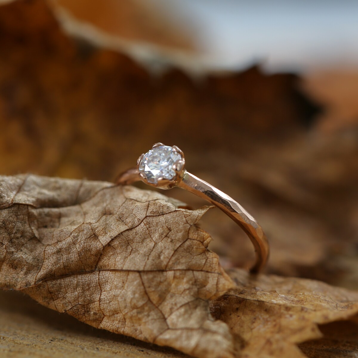 We have used 14k gold (it can also be made in yellow or white gold) and set it with a 5 mm Moissanite gemstone.