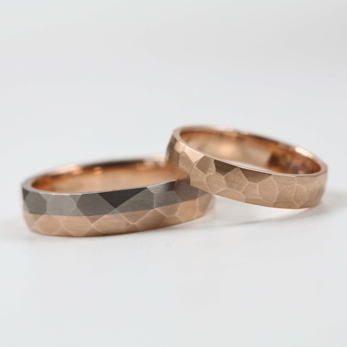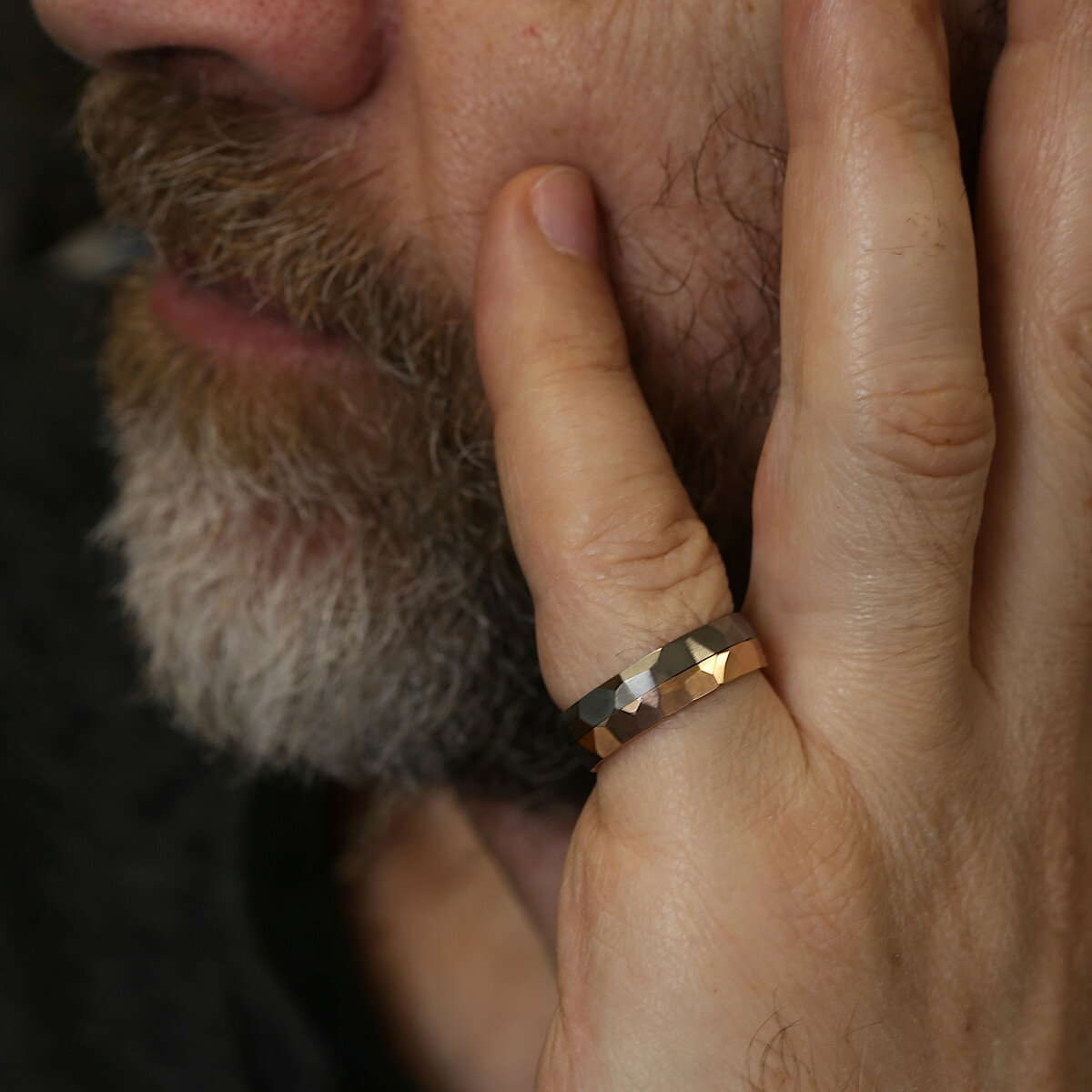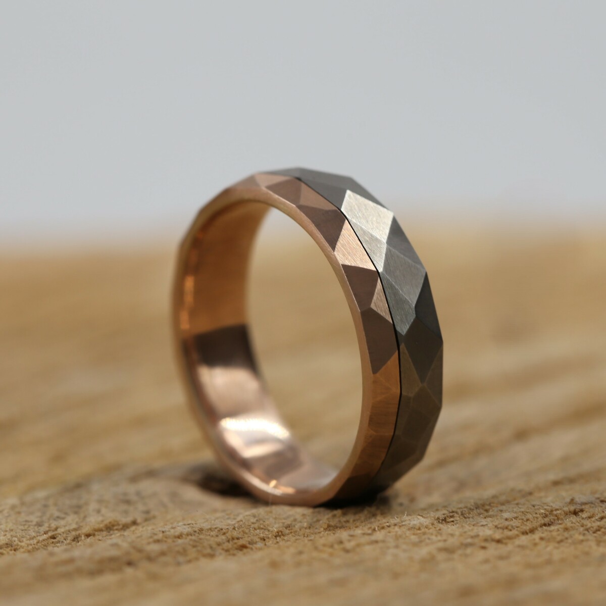 Precious metals can be combined with a stainless steel, titanium or damasteel. Thanks to this combination, the ring gains a mark of attractiveness and uniqueness. A combination of different precious metals creates an amazing MOKUME GANE which is unique for its beautiful structure of blended metals.