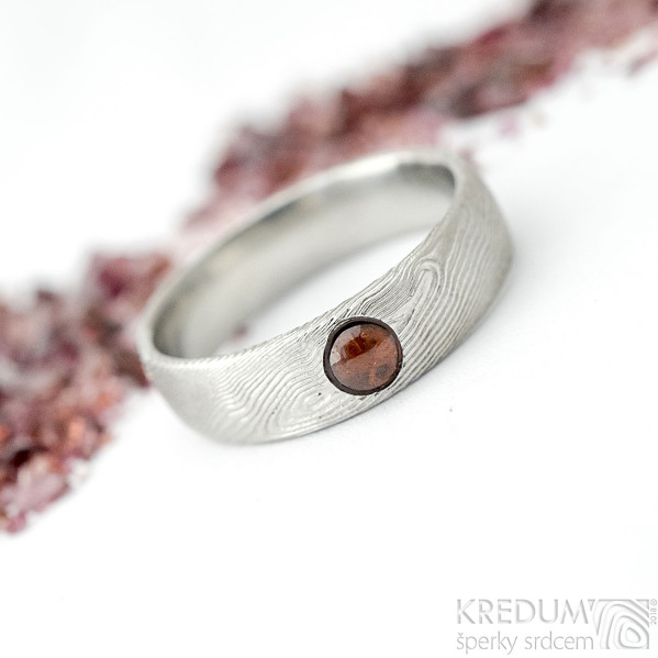 Ručně kované snubní prsteny z nerezové oceli damasteel. Jedná se o materiál, kde dochází k vrstvení dvou nerezových ocelí. Tím vzniká neopakovatelná struktura, která dává prstenům nevšední a jedinečný vzhled připomínající dřevo. Lze je vyrobit také v jiných strukturách.
